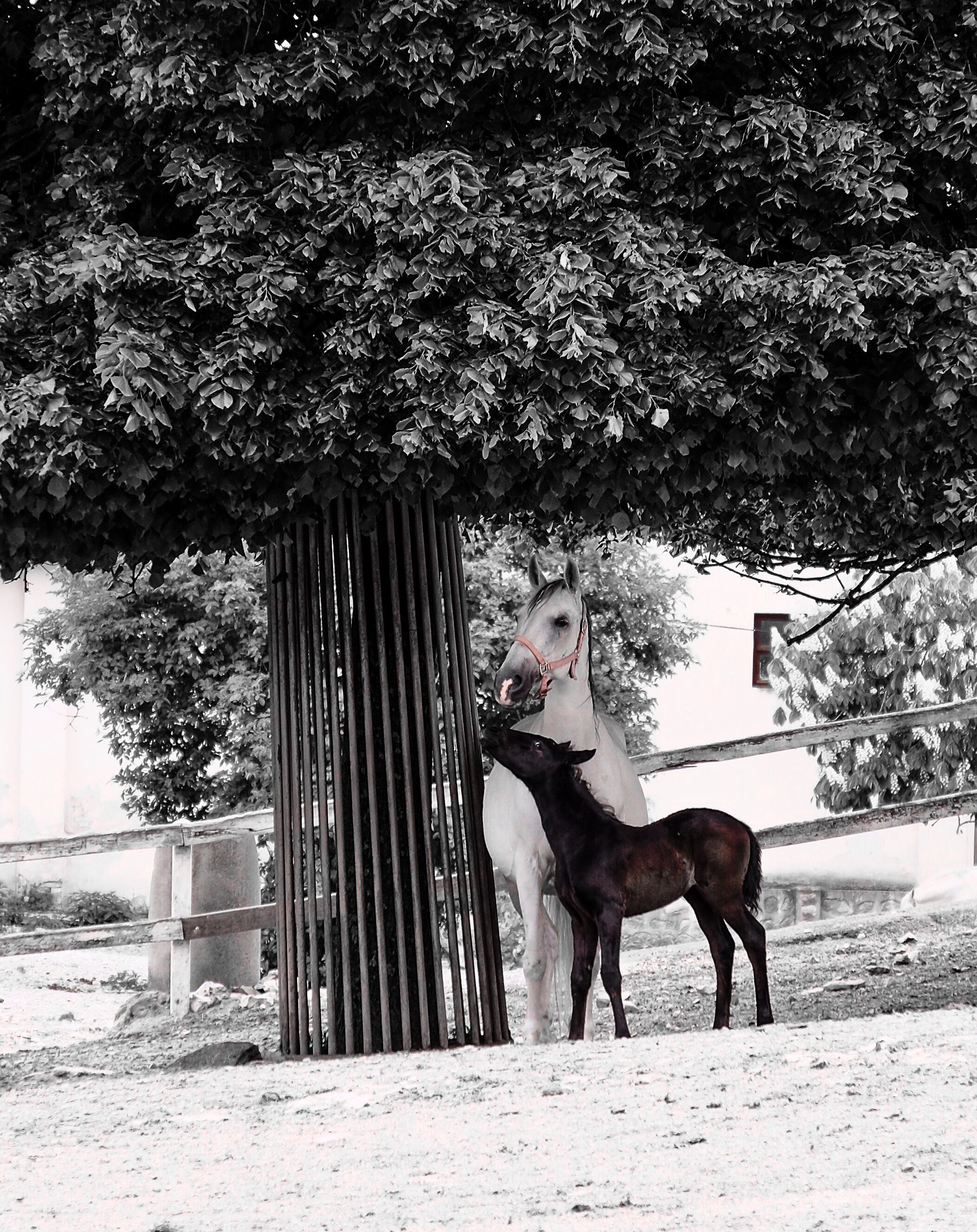Foals and their mothers are kept together in a yard for a period of time, and then are pastured together until the young horses are weaned. Once at pasture, the young horses are separated by gender.