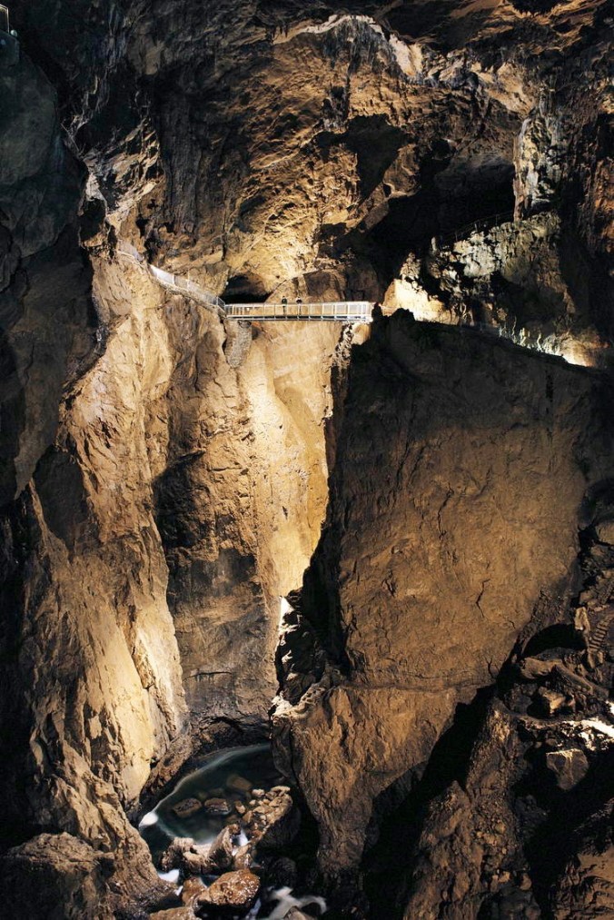 Around every corner was more spectacular scenery, as well as the increasingly loud sound of rushing water. Remember the river from before we started the tour? Yup…it runs right through the caves and comes complete with an Indiana Jones-style bridge suspended about 150 feet above! It was an extremely narrow bridge and it seemed precarious although it was perfectly safe. Yes, it was a little freaky. Both of us were happy to get across, but Jim practically ran for terra firma when he neared the end!😆 Here’s another picture from the official website. Can you imagine if photographs were allowed inside the caves? Everyone would be stopping on that bridge for selfies!😂