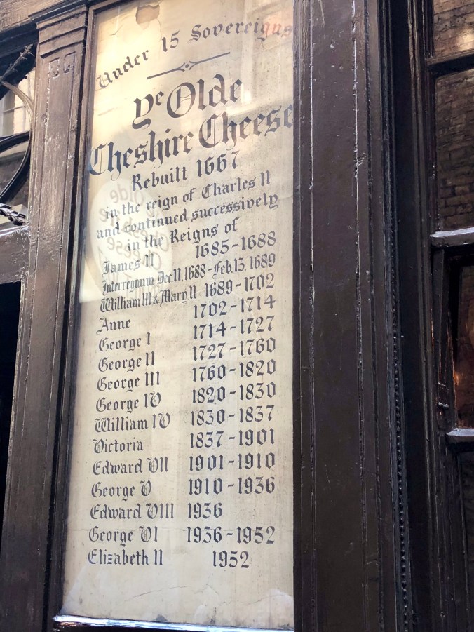 In a narrow alley just off Fleet Street is Ye Olde Cheshire Cheese, which lays claim to being one of the oldest pubs in London. There has been a pub in this location since 1538, and the current structure was built immediately following the Great Fire. Maybe not the oldest, but plenty old!